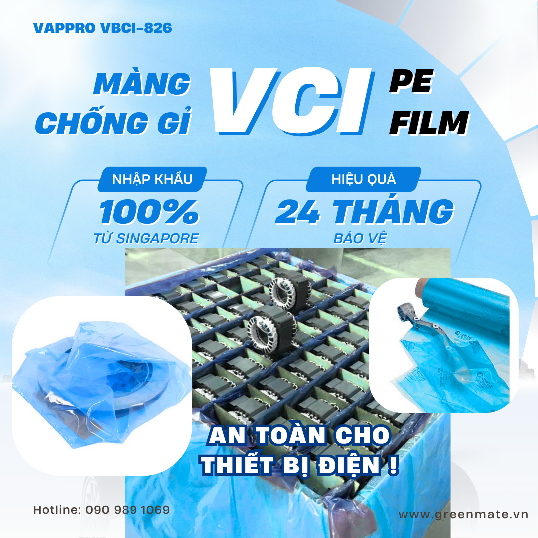 Các loại màng VCI, màng PE film hay màng chống rỉ sét VCI là vật liệu dùng đóng gói, bọc, bảo quản bên ngoài các sản phẩm kim loại, máy móc, thiết bị để bảo vệ kim loại tránh khỏi rỉ sét, oxy hóa và chống lại các yếu tố gây ăn mòn, mài mòn khác từ môi trường như độ ẩm hay ô nhiễm, lớp chắn hoàn hảo để bảo vệ kim loại an toàn khi đến tay người tiêu dùng. Và màng VCI Vappro VBCI-826 là một trong những lựa chọn hoàn hảo khi nhắc đến màng chống rỉ.