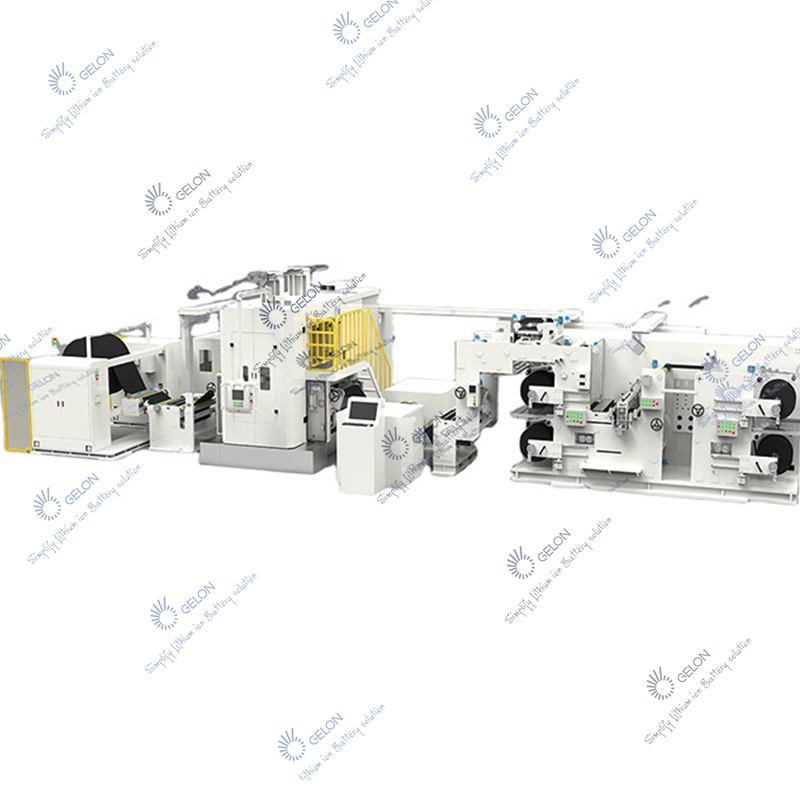 - Máy sẽ cuộn các điện cực dương / âm sau khi phủ liên tục qua máy lăn áp lực thủy lực liên tục, cán đều các điện cực theo độ dày theo yêu cầu của quy trình, sau đó xẻ thành 2-4 điện cực đáp ứng chiều rộng yêu cầu công nghệ, và tua lại với căn chỉnh.